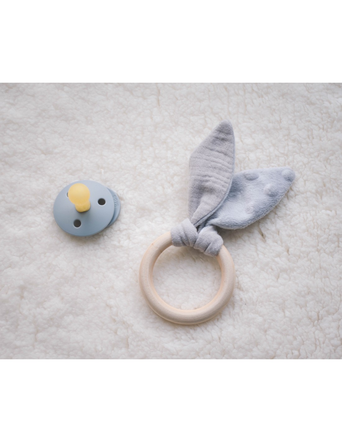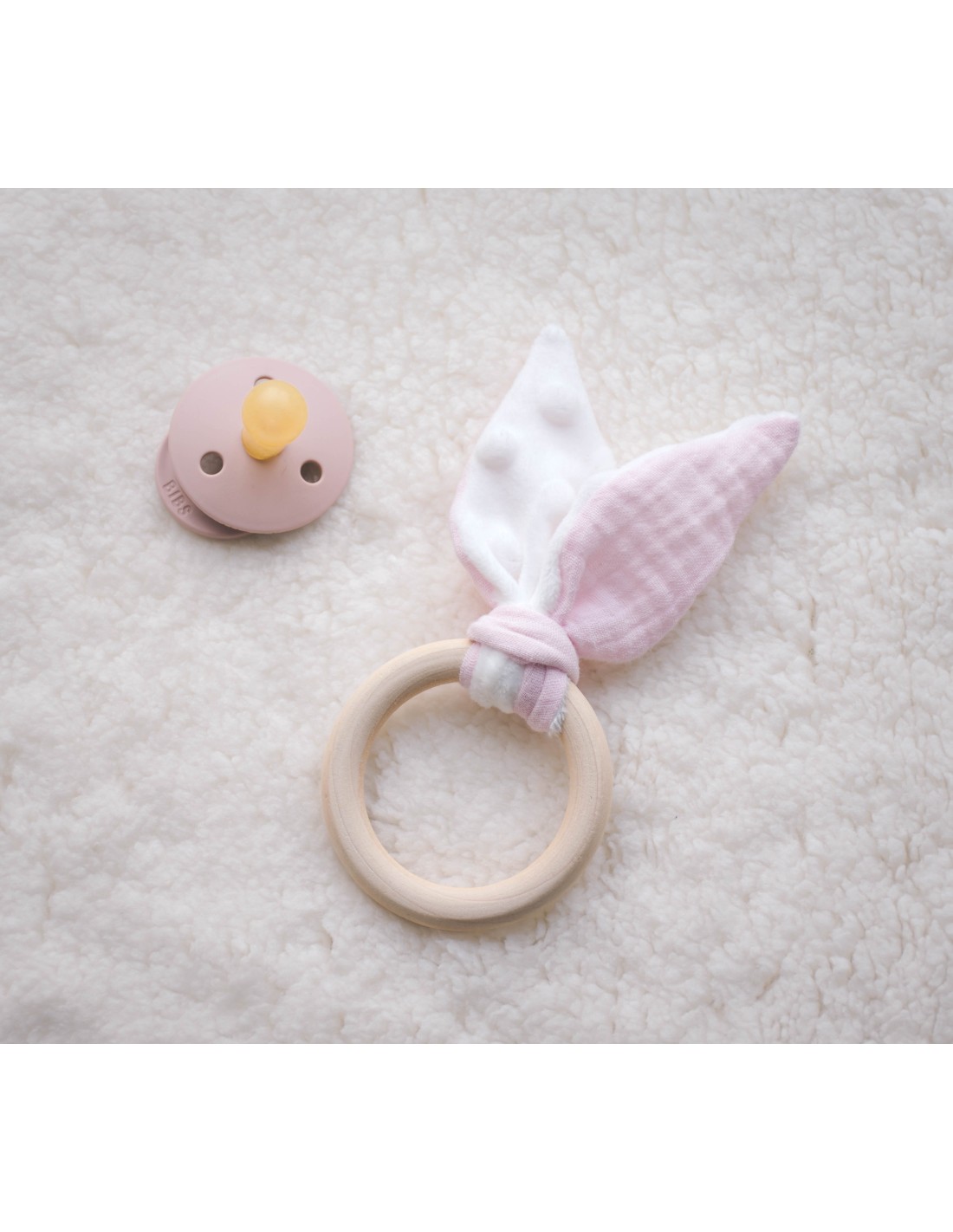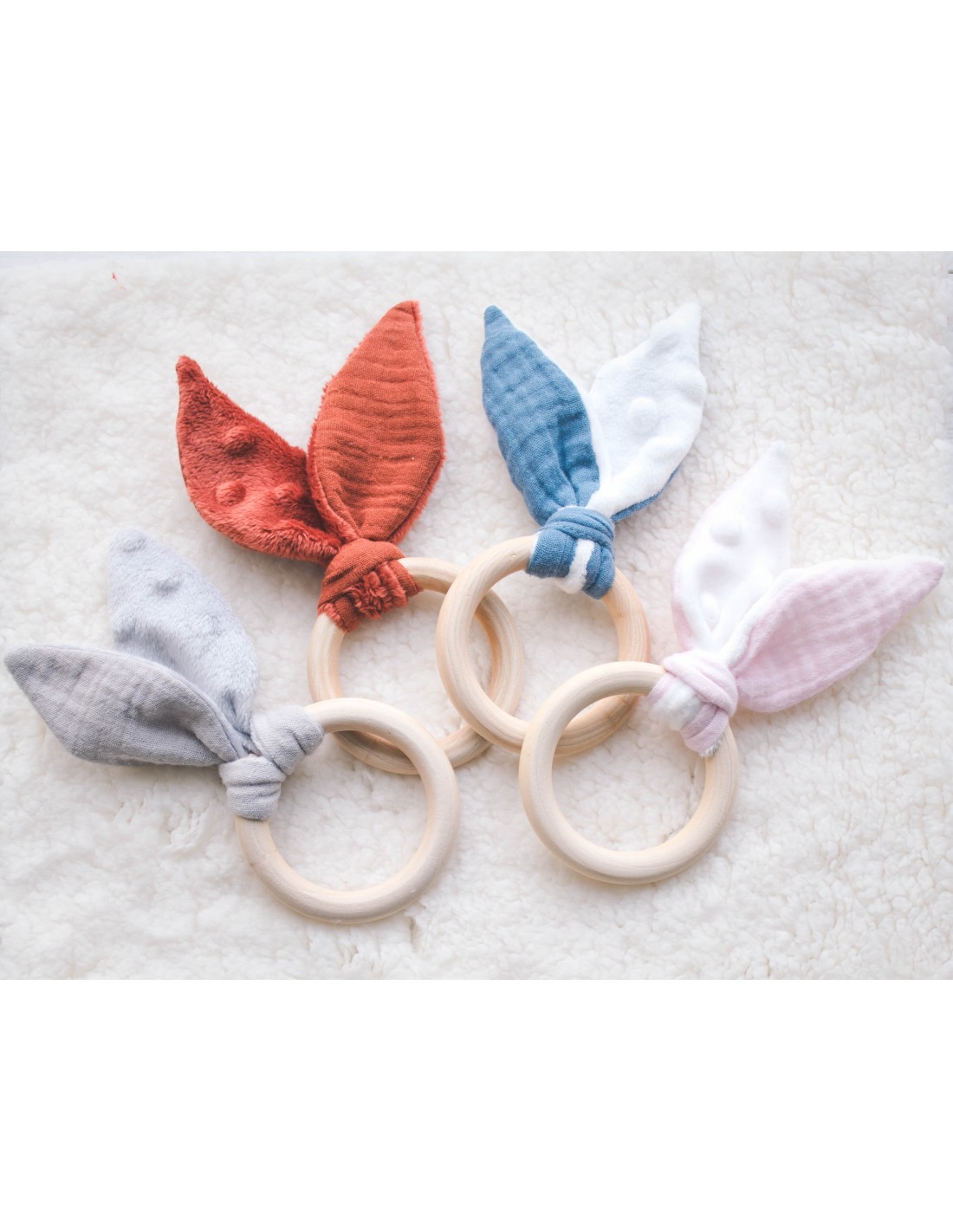 Cet adorable anneau de dentition est conçu pour soulager les gencives de bébé tout en stimulant son éveil sensoriel. Il est composé d'un anneau en bois de hêtre naturel, idéal pour être mâchouillé en toute sécurité, et de douces oreilles de lapin réalisées à la main en double gaze de coton et minkee ultra-doux.