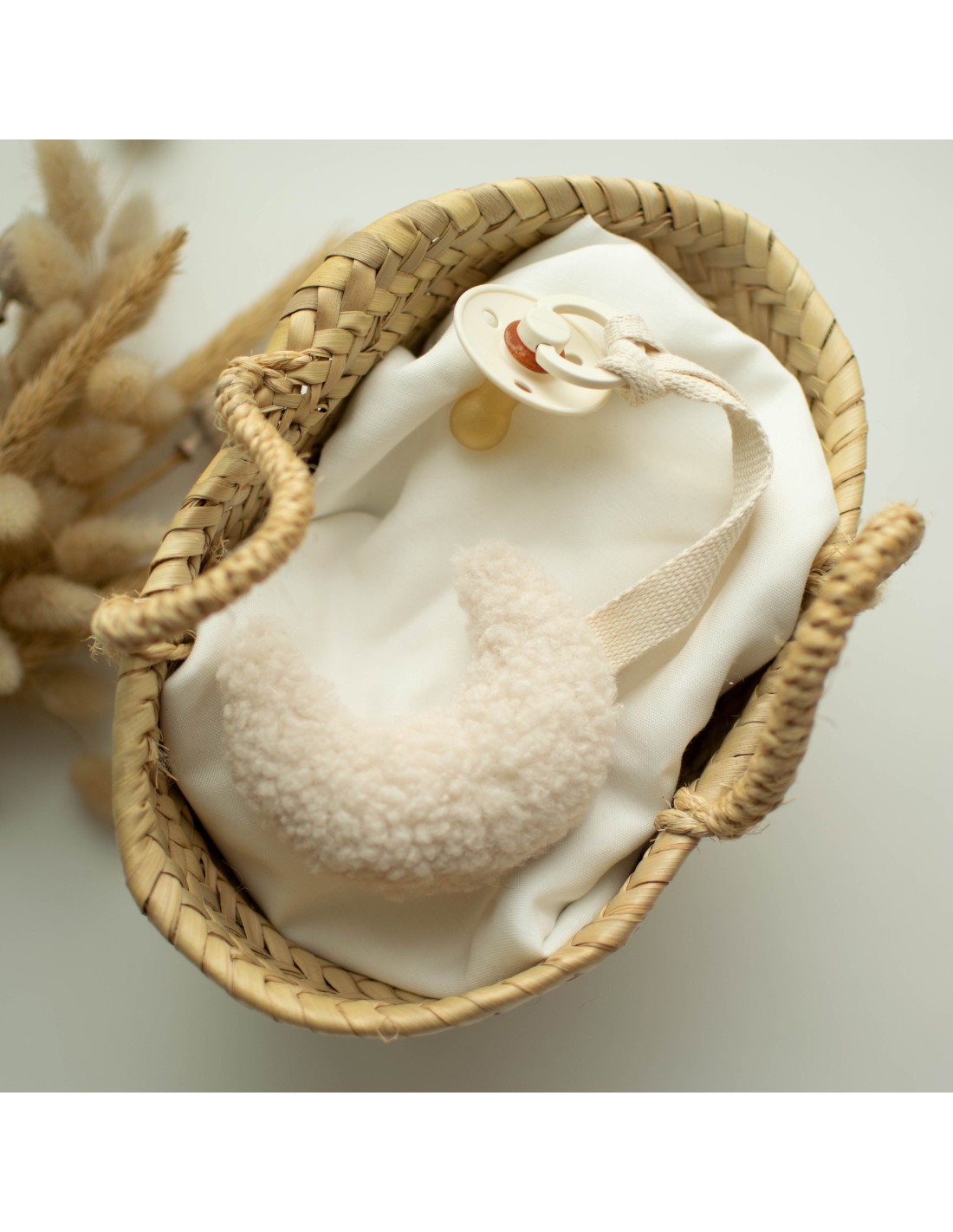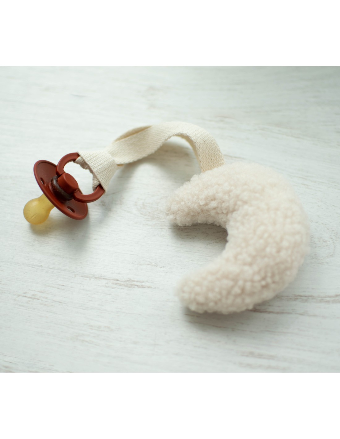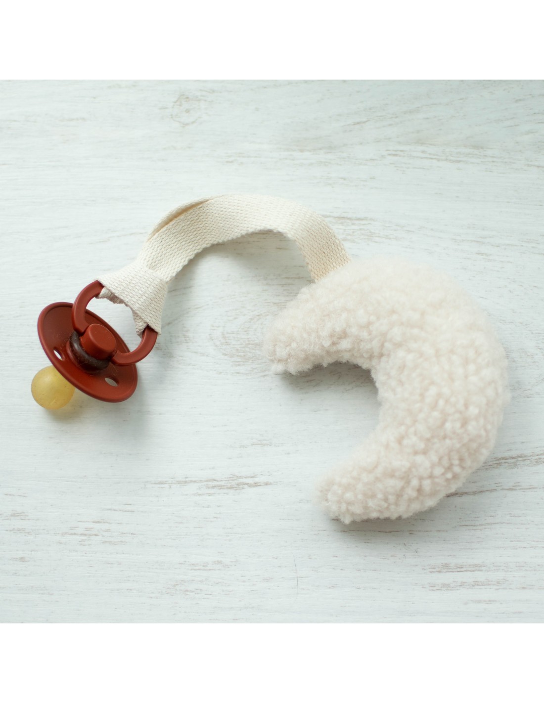 ♥ Cette attache-tétine Lune en Sherpa est parfait pour éviter de perdre la tétine tout en rassurant bébé à tout moment.